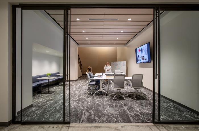 As you turn the corner, a blend of height adjustable workstations help support the modern workplace needs of Office Revolution’s sales, project management and design team. Teknion’s glass and demountable walls are on display through construction of conference and huddle rooms to support varying needs of privacy, ergonomic and technological integration.