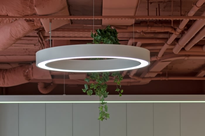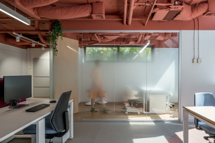 The second design strategy was to generate a strong and dominant element through the whole building offering a contemporary spatial experience and a vivid corporate id. The concrete ceiling was unveiled, the existing mechanical infrastructure was upgraded and everything together got painted in a peachy tone that unifies the working space on each floor while creating a strong spatial id aiming to generate positive feelings and motivational behaviors. The floor design distinguishes the diverse functions and propel a more user friendly flow through the open space.