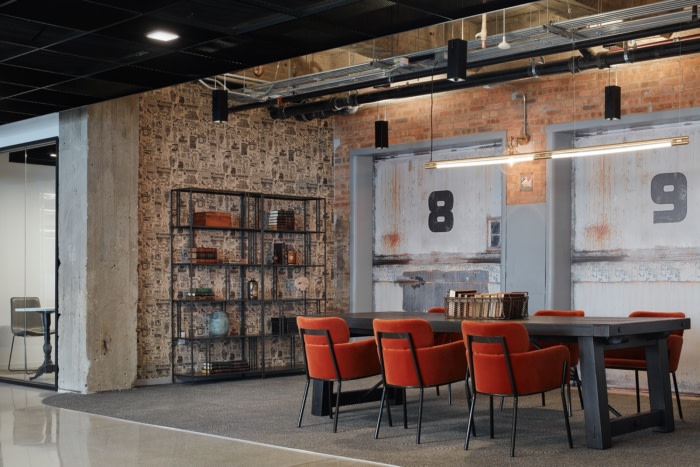 As a former mail sorting warehouse, the suite’s existing architectural assets included large, factory-style steel casement windows, high ceilings, and rustic concrete columns, which we worked to highlight in our design. We revived the spiraling mail chute as a sculptural focal point and created a feature wall of Postal Service relics, bracketing the suite with powerful storytelling elements. In addition, a single salvaged freight door inspired us to make it a sequence using clever graphics that fool the eye.
