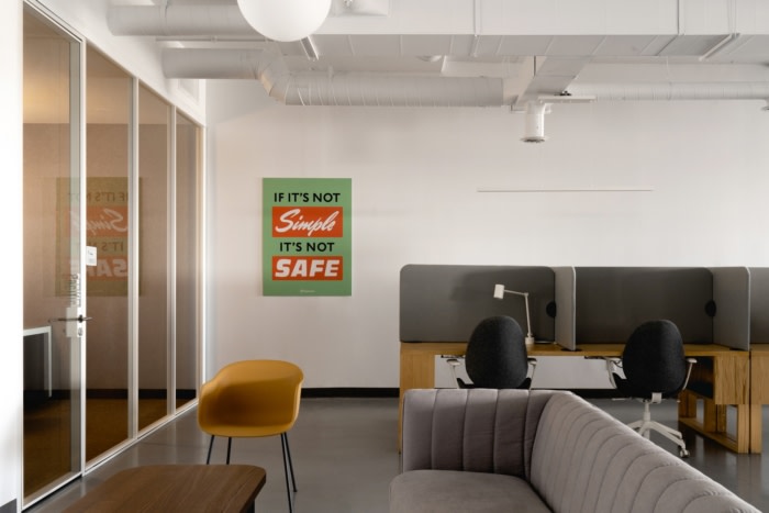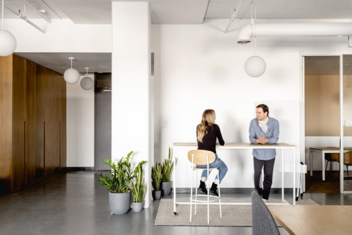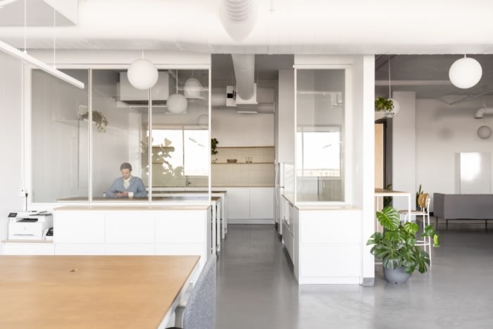 The office also includes a closed work room and a meeting room that can accommodate 8 to 10 people as needed. Open-plan workstations make use of felt dividers for privacy between employees.