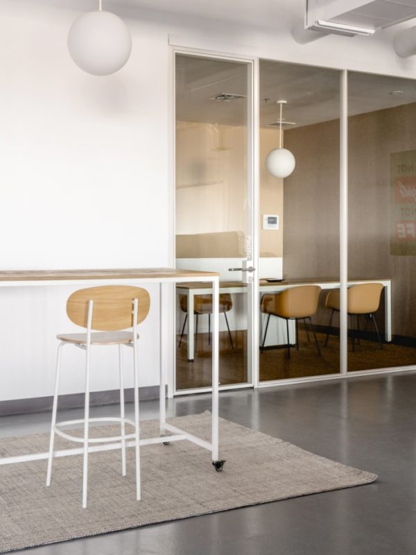 Upon arrival at the Opslock offices, visitors have access to two meeting rooms that can accommodate 4 people. A rental system allows for good management of spaces, so that they are used to their full potential. The integration of custom-made wooden furniture provides functional storage and defines the reception area. Not needing a formal reception, we step into a friendly office that goes beyond conventions.