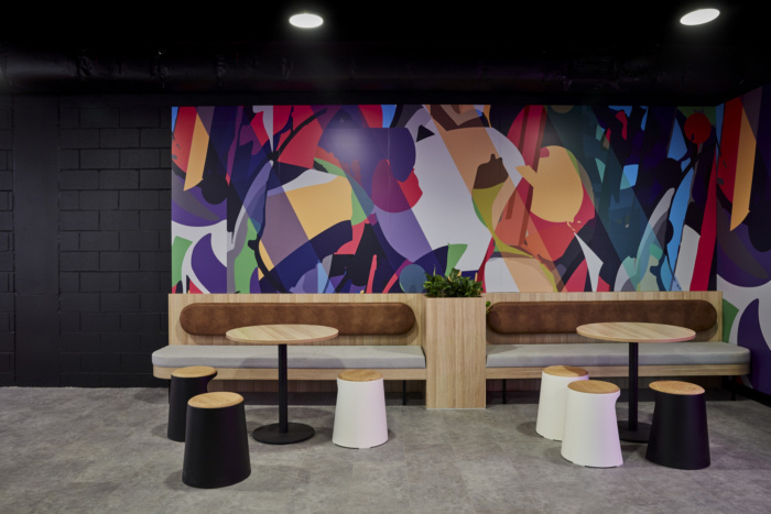 There’s plenty of opportunity to unwind and relax. Bold graphics, bright colours and neon lights played a part in transforming space in the rooftop into an epic games room complete with a bar, facilitating informal interaction and team culture.