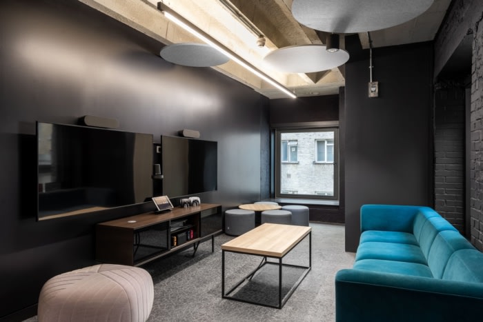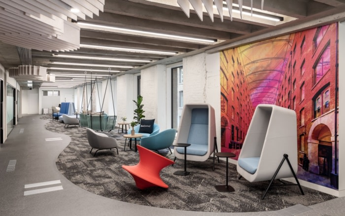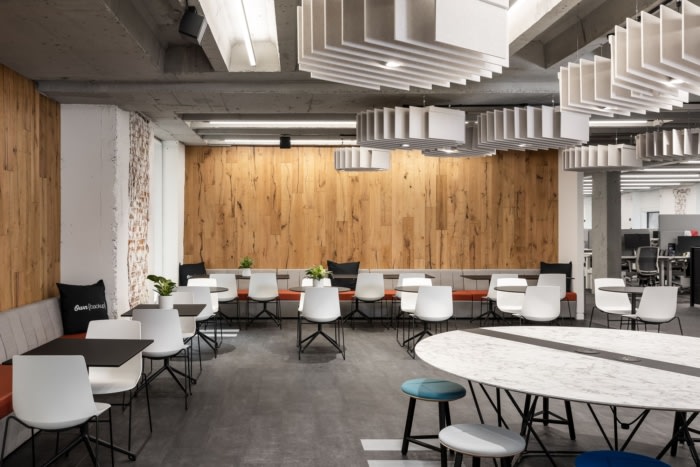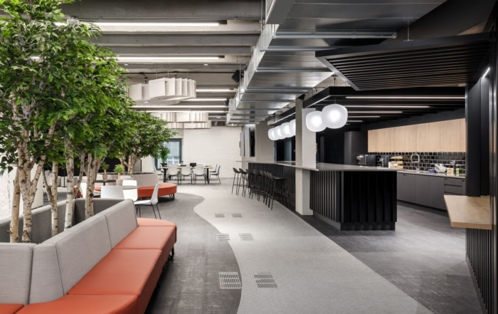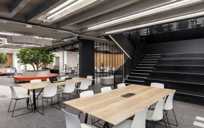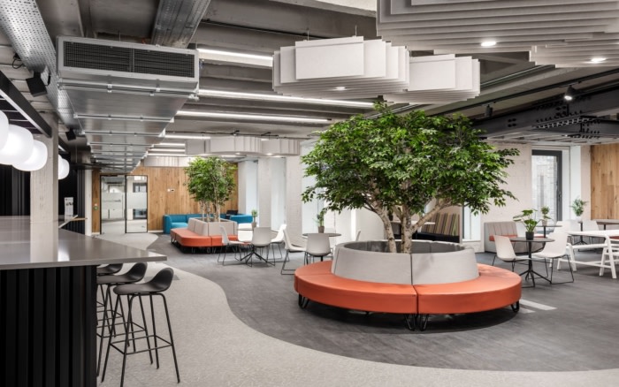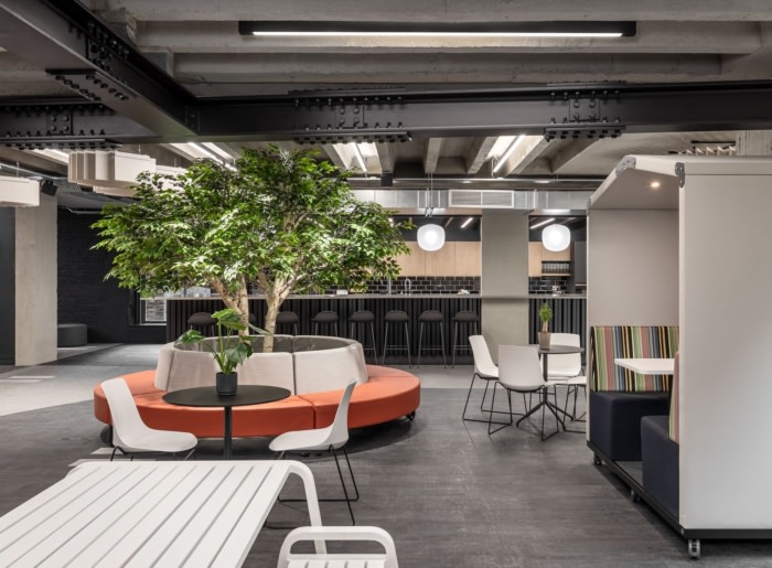 Inspired by the shipping containers at nearby BOXPARK, Oktra clad the teapoint in corrugated metal, installed beer and prosecco taps, and a food hut. The multifunctional space is easily accessible from both floors and can be used for everyday lunches and breaks or to host company-wide events such as their quarterly global presentations. Further London character is injected into the space with indoor trees surrounded by benches, a nod to London’s iconic parks that characterise the city.