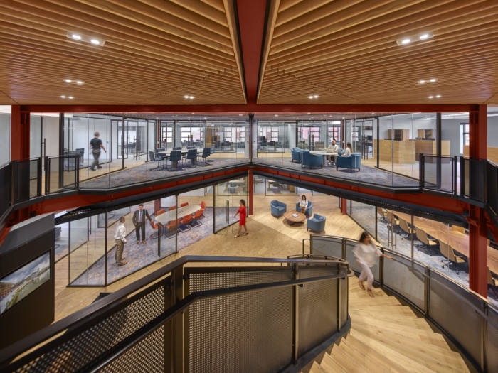 A red tone is deployed intentionally to highlight the structure and serve as a backdrop throughout the space. The structure became the organizing element for planning strategy and the finish and ceiling design. Transparent, triangular-shaped glass collaboration zones fit into the center point of the two floors in order to activate the two-story hub and make the workspace more flexible.