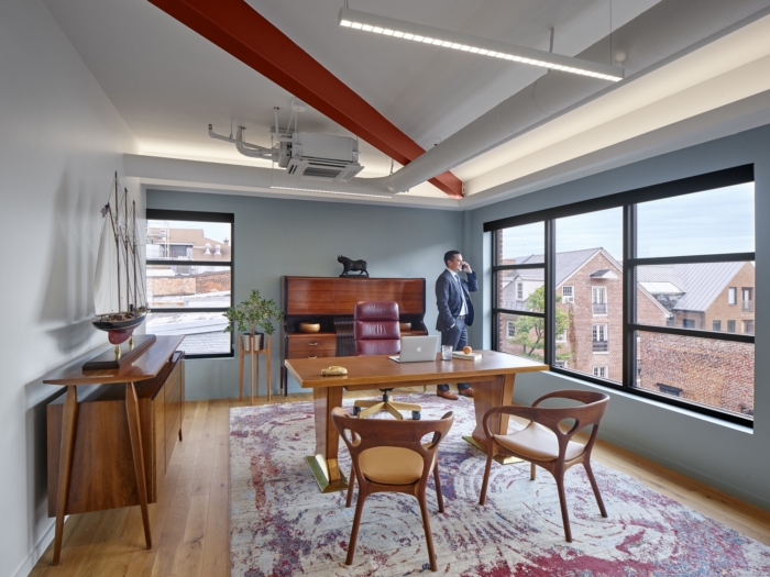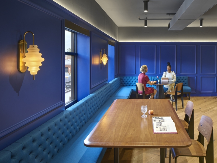 The steel framework of the building’s original structure remains, with visible mechanical, electrical, and plumbing throughout to underscore the industrial feel. The city’s classic reds and blues imbue the interiors, and the furniture embraces the warehouse aesthetic with a residential quality woven in. The exposed ceiling, beams, and steel-blue color of the meeting rooms serve as the common thread, revealing the building’s overall structure as users move through the space. The windows at the entrance are a milky mullion glass with dark steel frames, signaling an edgy vibe. End-cut wood flooring and custom rugs on both floors add texture and pay homage to the traditional Old Town aesthetic, but with a modern twist. A red beam pulls through the café and surrounding workplace, while the steel-blue is applied along the perimeter, acting as a backdrop that connects all the spaces together.