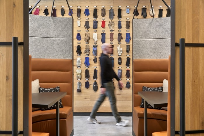 In creating a space for award-winning product designers, we knew that details were important. OXO and Hydro Flask are companies of makers, and we wanted their space to reflect the value that they place on honest, raw materials and simple, thoughtful design. A palette of natural wood, cold-rolled steel, and felt accents complement the concrete floor and industrial-loft atmosphere. Engineered wood flooring was reimagined as a wall finish that carries a streamlined warmth throughout the office. On its way, it serves as the backdrop for site-specific installations: a collection of found gloves symbolizing that OXO’s tools are made for all hands, a logo made of hundreds of screws, and a giant pegboard with shelves for displaying iconic products.