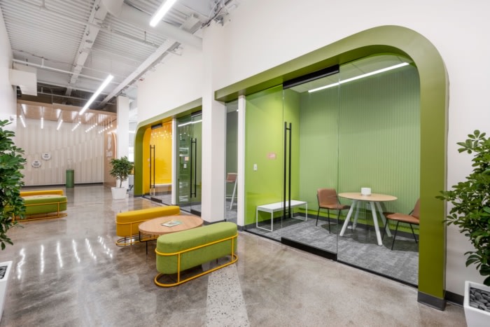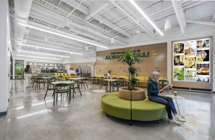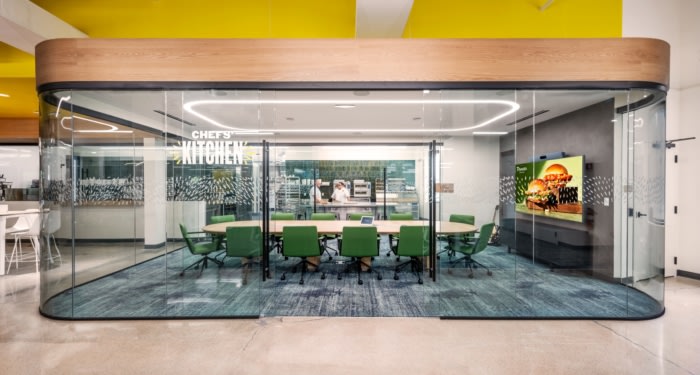 The backdrop of the open office space is the Chef’s Kitchen, which allows employees to see what new innovations are regularly taking place in the kitchen. This kind of transparency and environment for collaboration is integrated all throughout the workspace – from the open floor plan, large glass walls, and increased gathering areas.