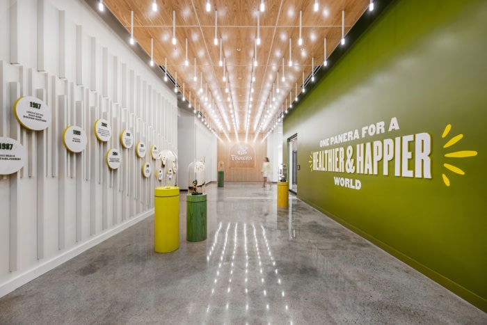 Upon entry, guests and employees enter the Brand Immersion Hall, which highlights key artifacts, important moments in Panera’s history, and even a custom light fixture that lights the path of the individual, symbolizing the bright future ahead.