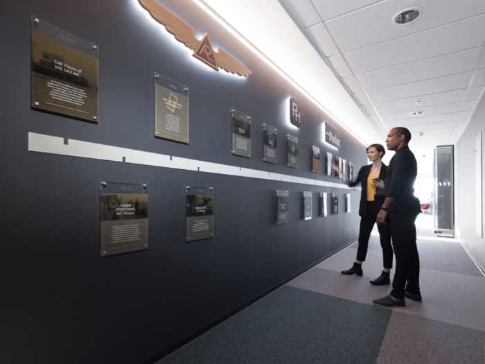 You enter the office in a reception free waiting area where the corporate colours and logo set the tone for the design of the whole office. The waiting area is immediately followed by a large meeting room. The visitors are therefore not crossing the working places and get a glimpse of the company’s history on a large design wall with the timeline of the evolution of Parker throughout the years.
