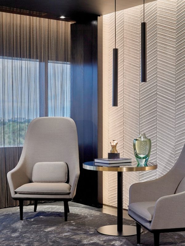 A palette of substantial material selections for the Reception Lobby creates an environment of rich and textural surfaces. Oversized porcelain slab flooring, oak planked millwork walls and curved ceiling soffits in deep tones evoke an impression of permanence and strength. A cubist reception desk of warm bronze provides a reflective focal point contrasting the surrounding architectural finishes. Monumental scaled seating positioned on pebble-shaped area rug islands create a sculptural foreground for the chevron patterned plush wallcovering.