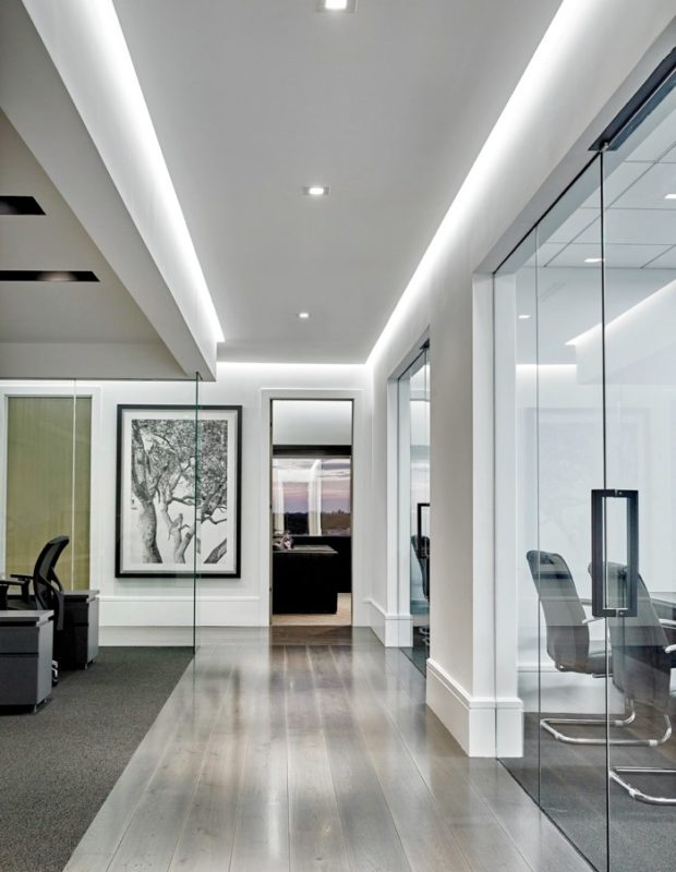Office spaces on both sides of the Reception Lobby transition to a brighter palette with greige stained wood floors, fresh white walls, and corridors with perimeter cove lighting. Glass fronted offices allow natural light to filter through the corridors and into internal open offices. The center of the office is anchored by a glass enclosed Conference Room adjacent to a Break-Out Lounge developed for casual meetings and work sessions. A collection of black and white nature photography introduces points of interest throughout.