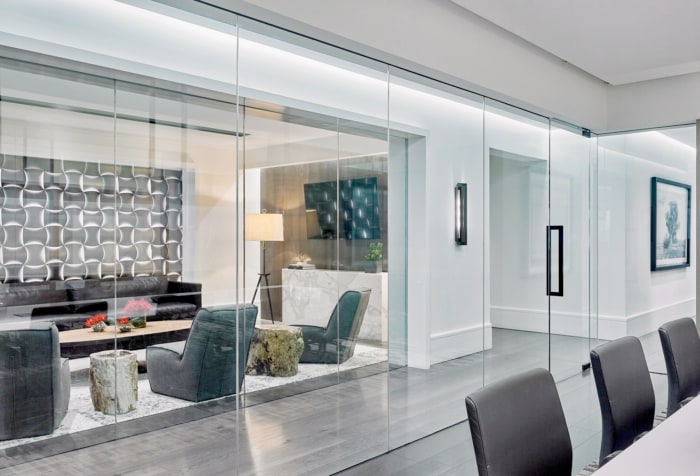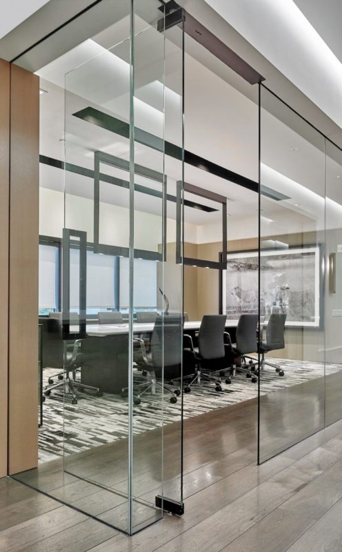 Adjacent to the Reception Lobby, the Board Room set for meetings and video conferences is accessed through a wood clad oversized pivot door that when closed is concealed within the millwork wall paneling. A stone topped table integrates modern technology allowing for unobtrusive video conferencing capabilities.