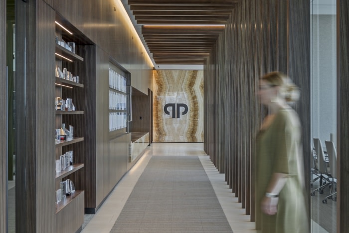 Particular emphasis was placed on the entry sequence, where visitors are greeted by expansive mountain and city views through 13ft floor to ceiling windows, a custom onyx branding wall and countertop with a cutout glass corner, hallways lined with millwork “trees,” providing natural wayfinding through design. EUA worked with the founders to architecturally express their values with a simple but commanding use of stone, wood, and glass, emphasizing Petrie’s commitment to honesty and transparency.