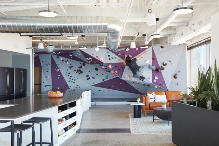 The break area includes a climbing wall and espresso bar, offering a much-needed respite, a contrast from the functions of a typical office.