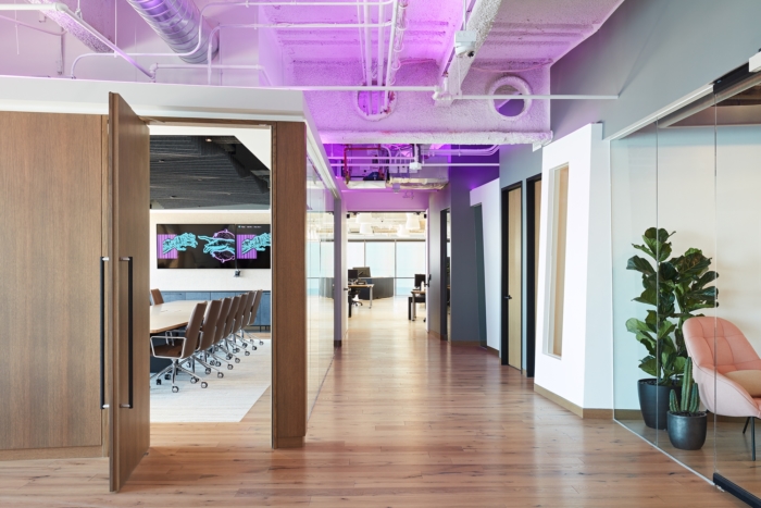 For an emerging leader in cryptocurrency technology, Blitz designed the workspace to manifest an offbeat counter-culture in a Class A office world. Views of San Francisco are juxtaposed with areas of tight focus while zones of open-ended contrast spaces fit for a specific purpose. A spectrum of finishes, from exposed ceiling mechanical to wood paneled walls are highlighted by colorful, adjustable LED light adding warmth and variability.