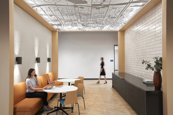 CRTKL pulled inspiration from landscape elements traditionally found in desert climates and turned them into unique features throughout the space. Upon entry, guests and employees are greeted by a large custom gabion wall, traditionally used in landscape design as a retaining wall made of steel wiring and filled with local rocks. Highlighting the craftsmanship style of Arizona, a custom rope chandelier hangs above the reception desk to create a warm and inviting space. Terracotta breeze blocks were brought indoors as a visual separation between the reception and café lounge area.