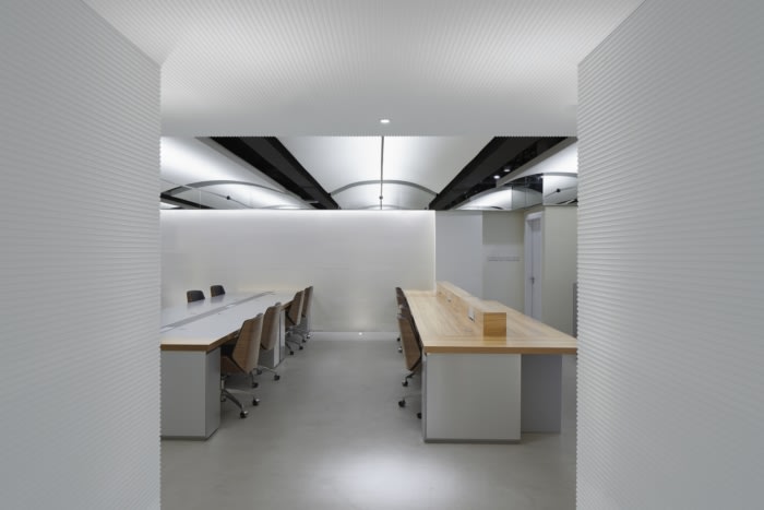 Studio DOTCOF has presented the concept of “working under the same roof”, which is a metaphor for collaboration between different branch companies on the group platform to develop and grow together. It has designed a number of long, white, cylindrical ceilings to form the semblance of large eaves. Then with light bars shining upward to brighten it, the light is guided through the arched ceiling and then refracted, forming a bright, soft, and diffusely-lit atmosphere. The long, cylindrical ceiling has put the untidy pipelines of the bare roof above out of sight, and at the same time the slight upward arch renders the low clearance less perceivable.