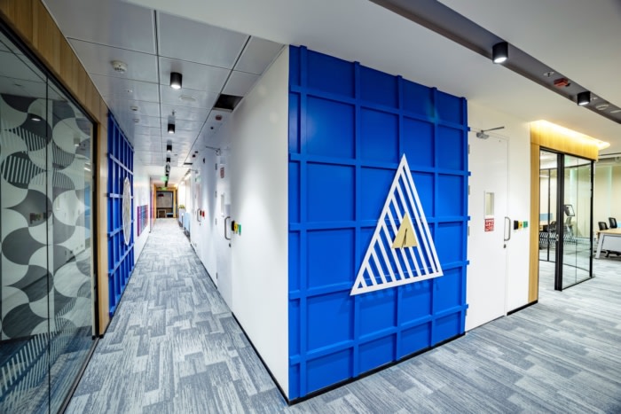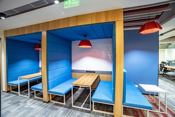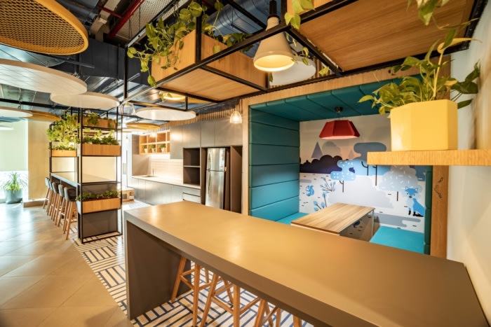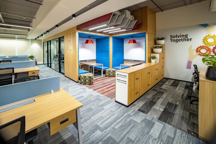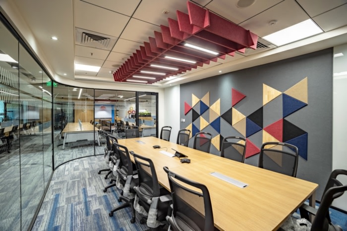To have acoustic treatment for the office, Acoustic panels have been used in different forms & shapes in the meeting rooms &collaboration areas to have noise reduction. The panels are used as a suspended ceiling with unique designs, Acoustic light fixtures are used in all meeting spaces which acts as a design element as well as serves the purpose. Panellingon partitions are done with a combination of triangular-shaped natural wooden panel & ACP panels including pop-up colours. Another major attraction of the office is the artwork & graphics highlighting branding & the office location being Hyderabad. The MDF CNC cut clock design is very unique &grabs the attention of people by bringing beauty to space.