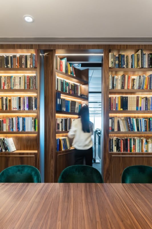 The library is a fantastic well-used area designed to be a quiet work space or it can be booked for meetings. Additionally this multi-functional room can also act as a dining room with the large table. A secret door then leads from the library into the events space allowing it to be used as a green room.