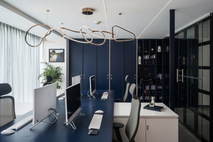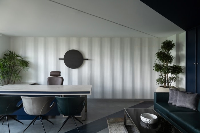 The entire office is strategically divided into two by a common area, that houses custom-made, ovoid swing chairs and entertainment consoles. Being one of the most interactive spaces, this space offers a transitional space in the office, as it is encompassed by all the individual office spaces in the house, irrespective of the department.