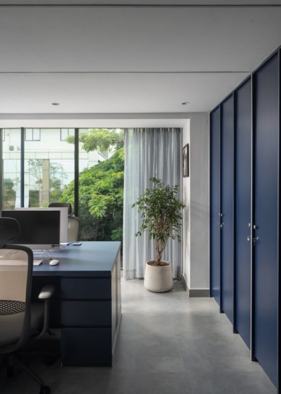 The space is an embodiment of the client’s love for nature and living alongside it, which reflects in the office as ample natural light, natural plants, and his feathered companions. The space opens into a lounge that is reflective of the green and tropical paradise that is Kerala while being rooted in the zen ideals of living and mindfulness.