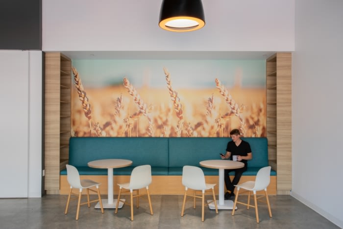 From there, nature flows inside. Across the double-height lobby wall, an abstracted wood tree in bas relief metaphorically shelters visitors. The walls of the large cafe, meeting and breakout areas feature bright floor-to-ceiling flower and plant photo closeups, bringing even more landscape indoors. The biophilic design direction is also reflected in wood furniture pieces and a vibrant color palette that infuses open and private offices, a gym, mother’s room and other amenities.
