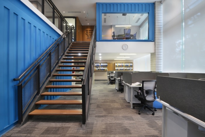 Being one of the hallmark industries of the industrial era, it is thereby fitting for a shipping company to have their office designed in the industrial style. For this design, metal plates are shaped, stamped, and embellished with custom handle details to look like shipping containers. This main ornament is combined with clean-cut finishes to provide a lively spin in the office space.