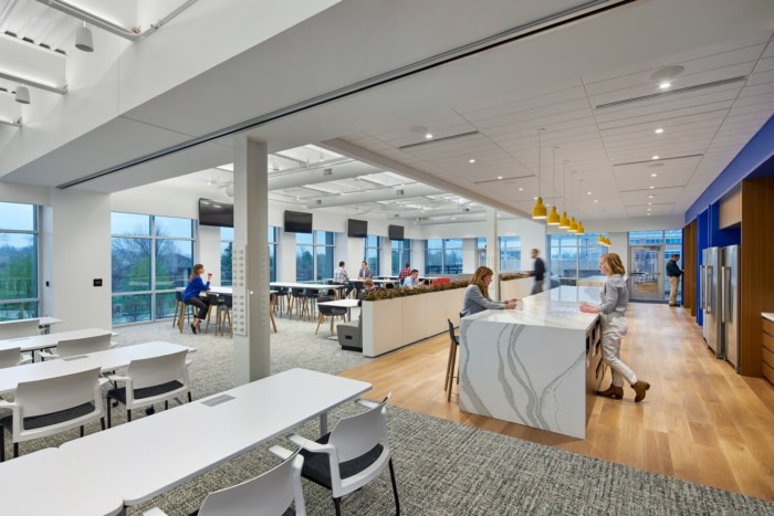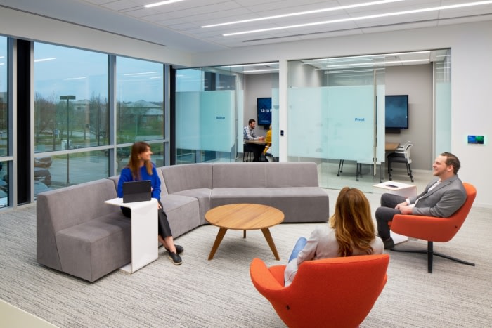 Varied spaces to foster teamwork among small and large groups are located throughout; common areas with high-top tables to encourage impromptu conversations, huddle rooms, bench seating in high-traffic areas and booth seating in the break room are all incorporated. A central break room for collaboration and socialization, that opens to a new patio with a fireplace, was also carefully designed to further add function and feature to the space.