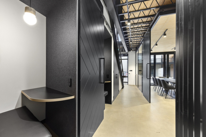 The open plan workstations were relocated to the first floor of the tenancy, which allowed us to enhance and utilize the use of space downstairs. The perfect opportunity arose under the open riser of the staircase. With precision we designed a private work space which allows the staff to be able to make a private video or phone call. All walls and ceiling of the booths are cladded in an acoustic panel to trap noise. An added feature is the sliding barn door, if you need some natural light or perhaps additional privacy you can slide the barn door across the booths accordingly.