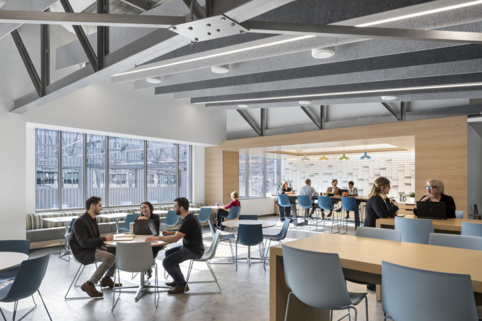 The original warehouse’s superstructure, featuring 8-foot tall steel roof trusses and rough-hewn wood ceiling plank, provided the initial inspiration for the fitout, which encompasses 47,000 square feet of space across three floors. Linear LED pendant lighting and felt panels in shades of gray run parallel to the trusses and provide both visual interest and acoustic baffling in the third floor vaulted studio spaces, which also include a shared kitchen and dining area, conference rooms, and open workplace.
