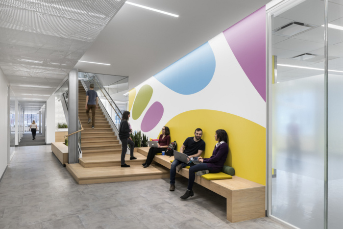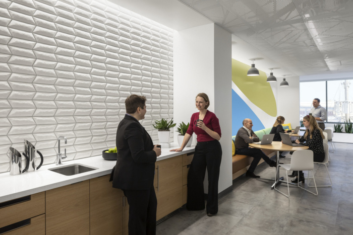 Key to the design was the project’s incorporation of local manufacturers and artists to contribute to the thriving maker-culture within the city. Signature pieces: tables and seating, come from Pittsburgh’s own Urban Tree, a woodworker that salvages wood from the local forests; and custom tiles from LimeLight, a family-owned-and-operated business located in Pittsburgh’s Strip District, was commissioned for the kitchen and dining area. These materials complement an interior palette of crisp whites, soft grays, and warm wood finishes punctuated by energizing shades of blue, yellow, and green. Felted wool panels, rich upholstery, unexpected tile backsplashes, modern furniture, and playful lighting fixtures further highlight this comfortable and professional environment. An embedded display case highlighting workplace artifacts from Blue Belt Technologies, the local start-up company Smith+Nephew acquired when it entered the local market, is positioned strategically at the base of the interconnecting stair.