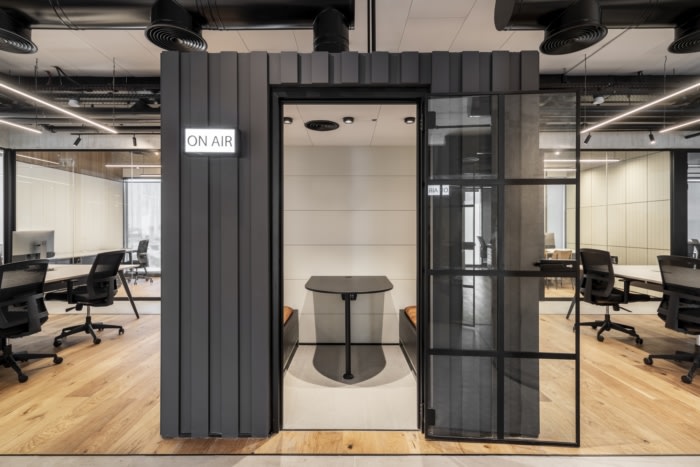 While much of the Soltics office space is clean and open, letting the creatives who work there do the imagination themselves, there are peeks of whimsy throughout the design. One such example is a private meeting pod in the center of a co-working space that features a retro booth layout and an “On Air” light on the outside to show when it is in use. Details like these can be found throughout the Solitics space, but are never overpowering or distracting.