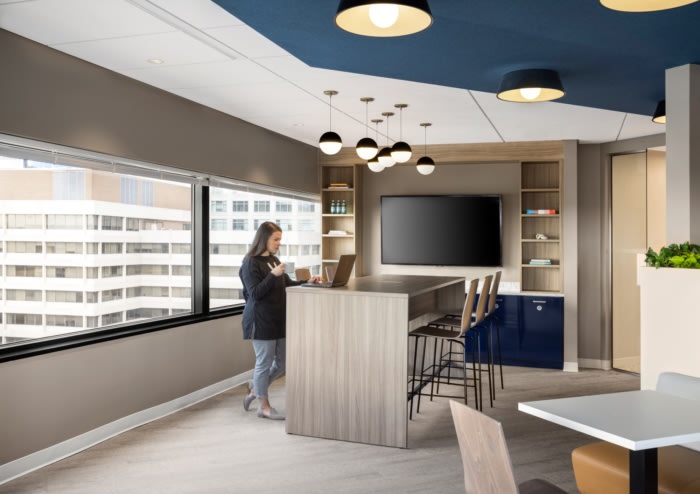 Strategic Investment Group (SIG) is an outsourced Chief Investment Officer, providing their clients with sophisticated and customized investment solutions. sshape worked with SIG to renovate their existing 36,600 sf space in Rossyln, Virginia. The main goal for this renovation-in-place was to create a flexible office that encourages collaboration while also taking advantage of the city views and natural light on all sides of the building. Upon entering the space, clients are welcomed into a warm and bright reception and seating area. The adjacent flexible conference center off the reception area provides a space for employees to meet with their clients or each other and an entertainment room for hosting events. An employee café with various seating options was designed on a prominent corner of the building, highlighting views of Washington, DC, and providing a space for employees to gather throughout the day. This human-centric design also features low workstation panels and glass office fronts to allow maximum light, visibility, and transparency.