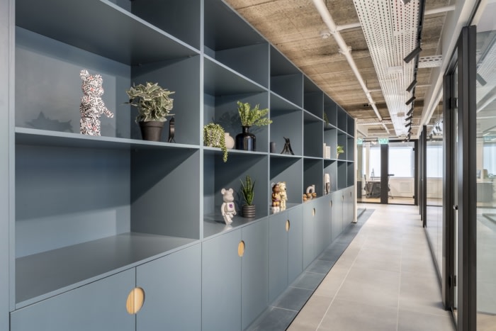 Throughout the Swimm office space, mid-tone blues meet natural greenery to liven up the design. This large, built-in shelving feature not only offers tons of storage space for necessary supplies and documents but also gives an opportunity to display playful decorations, vases, and useful books.