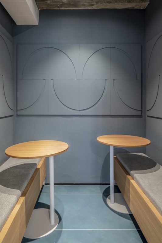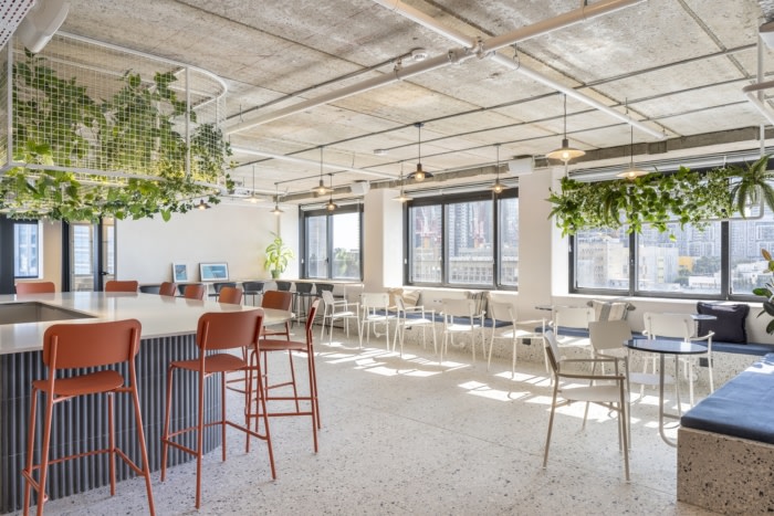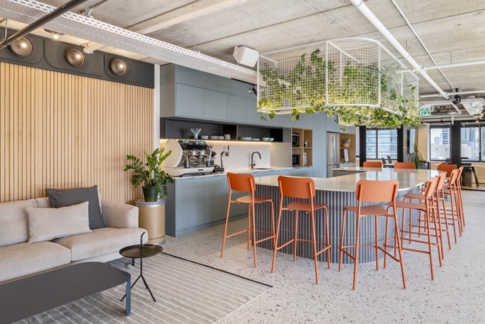 The kitchen space for Swimm features a large central bar with wraparound high stool seating. Bright oranges and muted mid-tone blues compliment each other and give the space a lively, youthful appearance. A large ceiling-mounted plant enclosure helps bring the outside into the indoor space and give the kitchen a calming appearance. Functionally, this kitchen offers anything an employee should need for break time, while also offering a more informal space to meet with each other or with guests to collaborate and ideate.