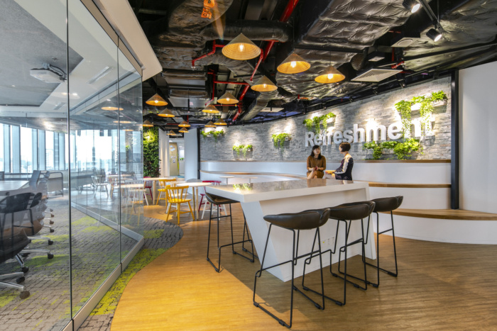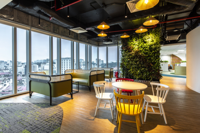 The inspiration for this office was predicated on the corporate culture and carving a sense of belonging among colleagues. Cohesion is the aim for this new premises, with plenty of space for social interfacing. The suspended lampshades resemble coolie straw hats, in a reference to local culture.