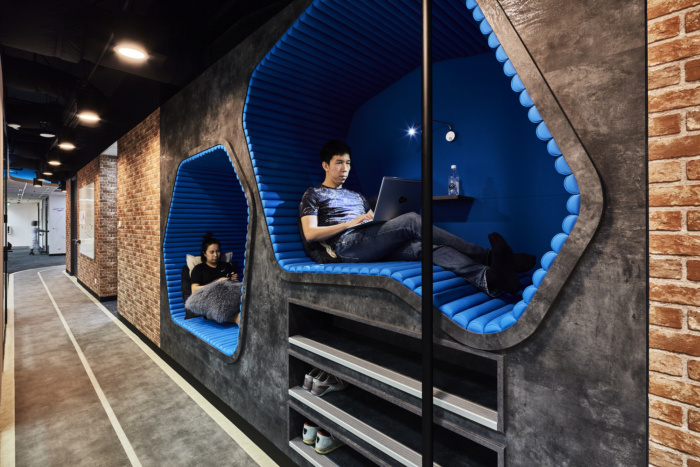 To support innovation and productivity, the office incorporates amenities that boost personal inspiration as well as creative teamwork. Ample gathering spaces in-between workstations draw employees to regularly engage in casual interactions and brainstorming. With its multiple layers, a strong layout is key to ensuring that users can navigate the new space with ease. A ‘running track’ concept devised along the office’s built-up core brings out a connective space designated for creative thinking sessions as well as rejuvenation, encouraging both ideas and employees room to grow. Lifestyle elements such as monkey bars and relaxation pods bring a sense of adventure and inject fun and vitality into the workday.