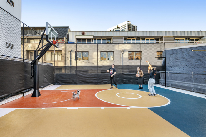 The spatial layout and design encourages interaction and connection of like-minded community members that share the communal spaces. Housing a variety of wellness facilities & communal areas, including an entry hub with a coffee bar, an internal meditation garden, a yoga studio, an outdoor terrace & basketball court, along with shower amenities and library. Open plan dedicated work spaces, private offices of varying sizes, quiet rooms, phone booths, as well as a range of formal and casual meeting spaces cater to the diverse style of members businesses and their functional requirements.