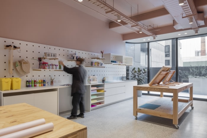At the heart of every successful co-working environment is its facilities and amenity. For The Commons South Yarra, Foolscap took this one step further, imagining a series of serviceable zones that cater to group and individual needs in a joyous yet highly multi-functional manner.The Commons’ standard facilities have been augmented to include the Makers Space, a fully functioning workshop for those hands-on jobs that involve tasks such as laser cutting, 3D printing, arts and crafts and more.