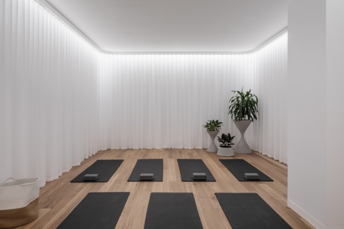 A Sensory Room offers patrons time to disengage, meditate or even practise yoga. Shoes are left at the door before stepping into an atmosphere of softness and quietude. Contributing to the hushed sense of calm and clarity is a minimal materials palette, curtain-lined walls, the ambient glow of concealed lighting and passive air circulation.