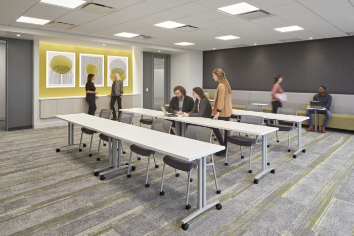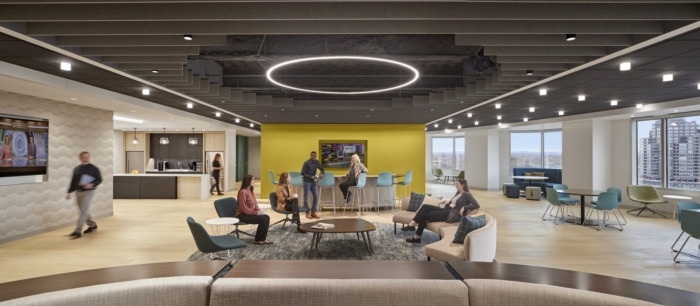 Long before the COVID-19 pandemic rewrote traditional office culture, the global insurance and technology services company The Hartford Steam Boiler Inspection and Insurance Company, Inc. (HSB) was already thinking about its workplace of the future. Collaborating with the design team, a concept evolved that would organize company teams into supportive “neighborhoods,” gathered around a central communication/gathering space. Designers tamed a challenging building geometry to accomplish just that on the 8th floor of the company’s riverfront headquarters. The concept will be tested and refined as a prototype for other floors the company occupies in the building.