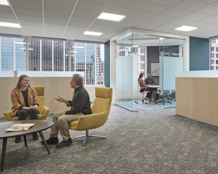 Natural materials like wood are used throughout, including wood panels on workstations, and cork wall coverings are used in enclosed meeting spaces to assist with acoustics. Formerly closed offices were moved away from the exterior window wall, allowing the perimeter glass to benefit all employees with a light-filled space and connection to the outside. A black ceiling panel gives the illusion of height and reinforces the open feeling.