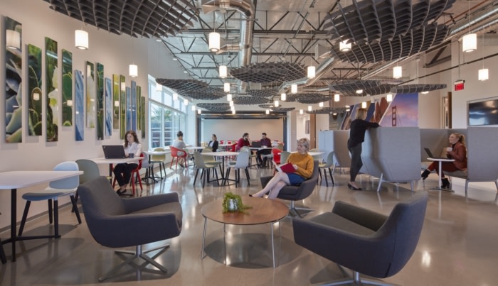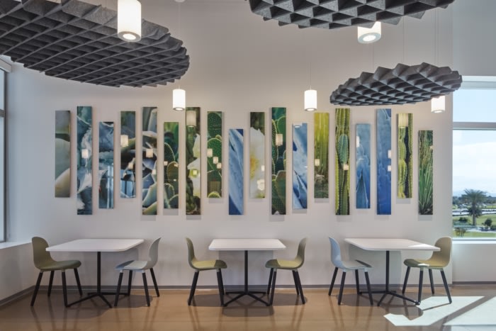 Toyota Financial Services West is a 56,219 square foot workplace organized into neighborhoods with a variety of spaces to support employees’ unique work styles and changing needs. Focus zones, formal meeting environments and informal collaboration spaces provide flexible and dynamic options for various work types. The office contains individual seating for 300 employees and features exposed ceilings to facilitate an open, bright and functional space. The design incorporates sound mitigation strategies including acoustical wall treatments and sound reducing 3form Clario Clouds. Ware Malcomb utilized nature-inspired materials such as stone, wood and greenery for a coastal aesthetic, creating a biophilic connection between people and nature.