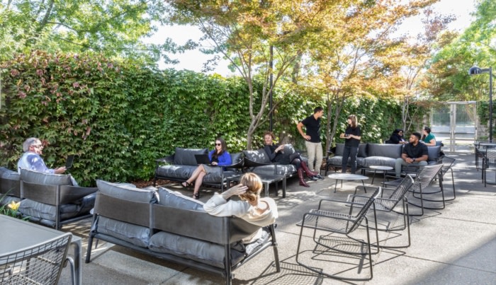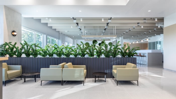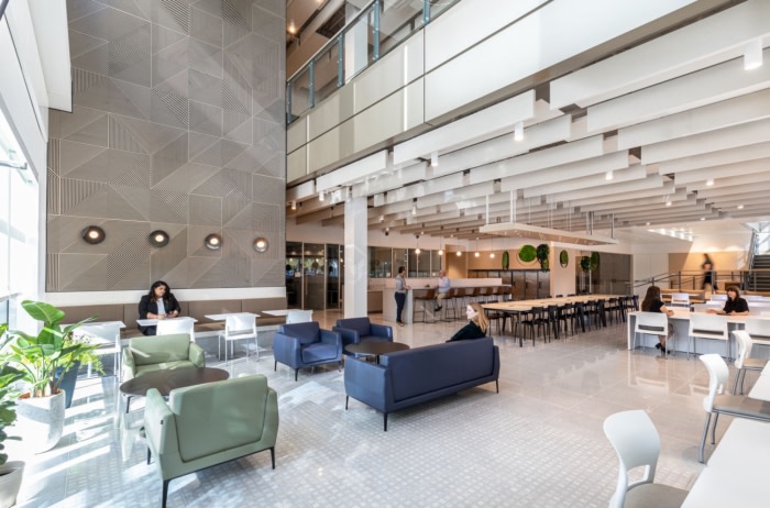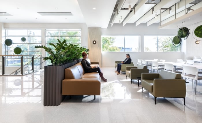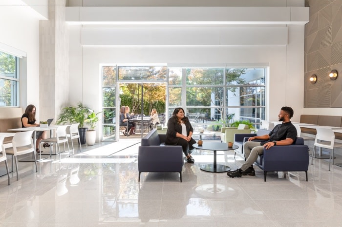 An indoor plaza serves as the central circulation point of the building, connecting people on both levels of the building. Coffee bars and collaborative lounges sprinkled throughout both levels support the natural tendency to gather around daylit areas. A two-level café connects the existing outdoor patio, extending the café and seating area, allowing staff to enjoy fresh air during the day.