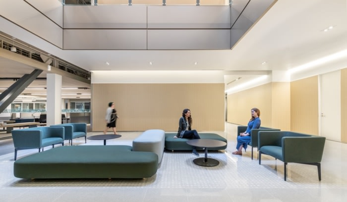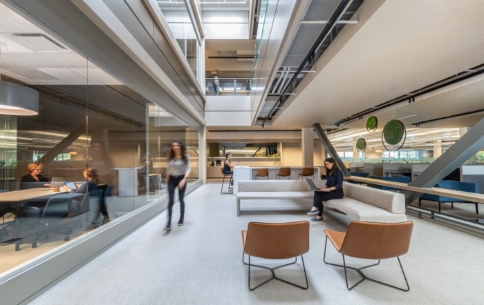 The Stantec design introduced multi-level lightwells with skylights to create new double-height spaces through the center of the building, bringing sunlight all the way down to the first floor. Adjacent to the lightwells, stacked cubes for key meeting spaces give the illusion of additional height while existing structural steel frames create sculptural drama and an open elemental feel.