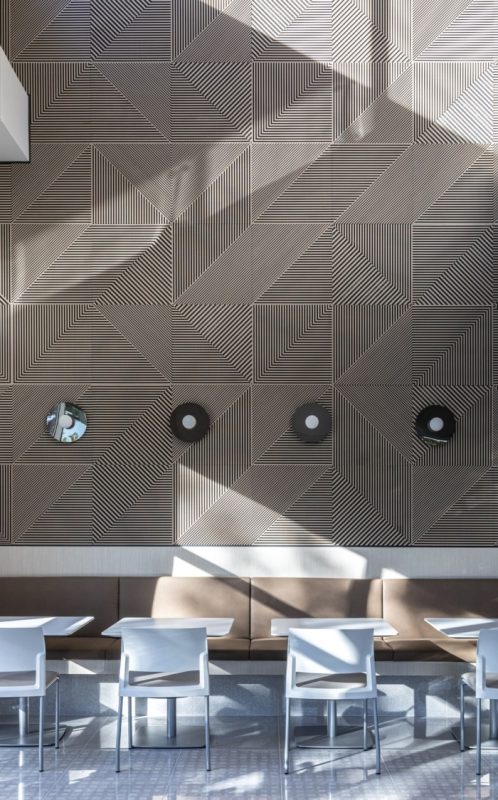 The building transitioned to all electric power and utilizes radiant panels for heating and cooling throughout. Free of ducting, the space provides direct heating and cooling to reduce recirculated air and potential for distribution of allergens. The double-height lobby with vertical walls, incorporates radiant panels, minimizes heat gain, and provides a monumental feel upon entry. The project successfully met the client’s goal, and the building is currently on track for LEED Gold and Net-Zero.