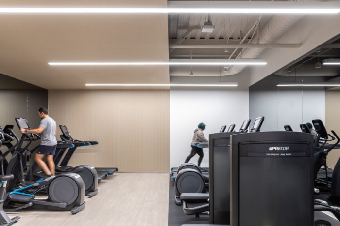 To promote wellness, once enclosed stairwells were opened and celebrated. The two main stairs at the lobby and café invite and encourage occupants with raised wood platforms, textural plaster walls, and dynamic lighting. The celebrated stair in the café encourages cross collaboration and socialization between departments.