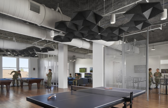 The design of the space embraces the history of the organization while looking to the future. The existing structure, ceiling, and skylight have been restored, paying homage to the building’s original design. Modern materials and finishes reflect the energy and activity of the center. Warm wood tones and dark metals balance vibrant colors and geometric elements, which create a comfortable yet invigorating environment. All of the design processes were approved by the Naval Facilities Engineering Systems Command and State Historic Preservation Office.