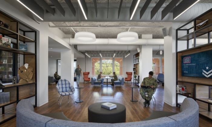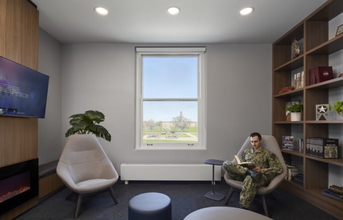 Perkins Eastman’s Chicago workplace studio collaborated with USO Illinois, construction manager Harbor Group Management. and contractor Leopardo Companies on the 15,000-square-foot renovation of the USO Great Lakes Center. Situated within the historic Naval Station Great Lakes, the United Service Organization’s (USO) Great Lakes Center provides a home away from home for service members and their families. The renovation honors the history of the installation, opened in 1911, while providing modern amenities and comforts for today’s service members and their families.