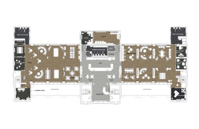 Perkins Eastman’s design focuses on flexibility, familiarity, and ownership. Beyond the entrance, a casual café, situated under the historic, restored skylight, links the two wings of the building into one cohesive space. To the right of the café is the library, gathering, and reflection area ideal for small groups and quiet activities. To the left, the space is designed for music, art, and recreation activities, complete with a pool table, dedicated professional e-gaming, outdoor competitive gaming, and a music room. The facility also provides pathfinder offices, a multi-purpose room, back of house support, and a kids’ room.